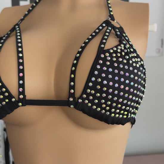 Our Vegas Collection bikinis are absolute showstoppers! The Ultra Bikini is strappy, encrusted with rhinestone and will grab attention from EVERYONE you encounter. These are eye catchers and will reflect lights from all angles. Adjustable, super comfortable and just the right amount of coverage to keep it sexy but not bare. Available in one size with adjustable straps all round.