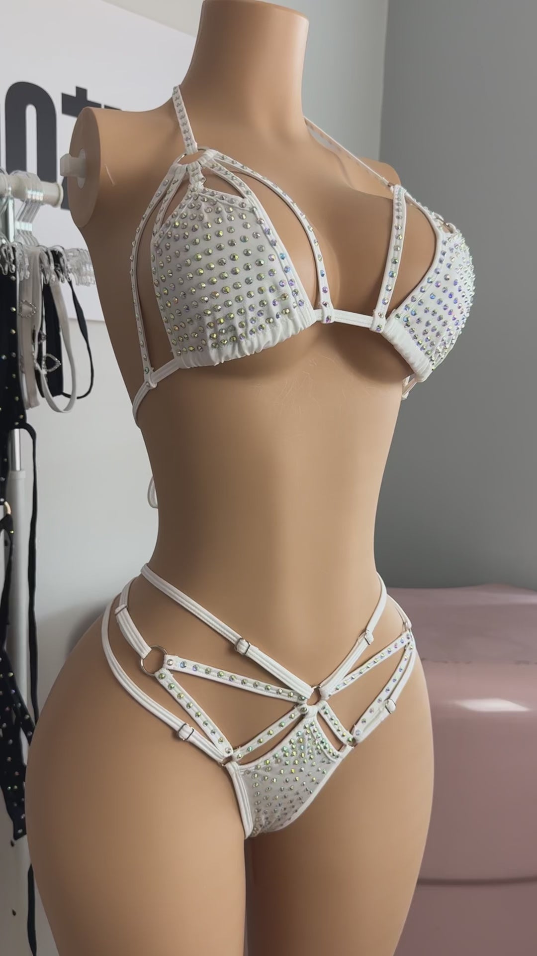 Our Vegas Collection bikinis are absolute showstoppers! The Ultra Bikini is strappy, encrusted with rhinestone and will grab attention from EVERYONE you encounter. These are eye catchers and will reflect lights from all angles. Adjustable, super comfortable and just the right amount of coverage to keep it sexy but not bare. Available in one size with adjustable straps all round.